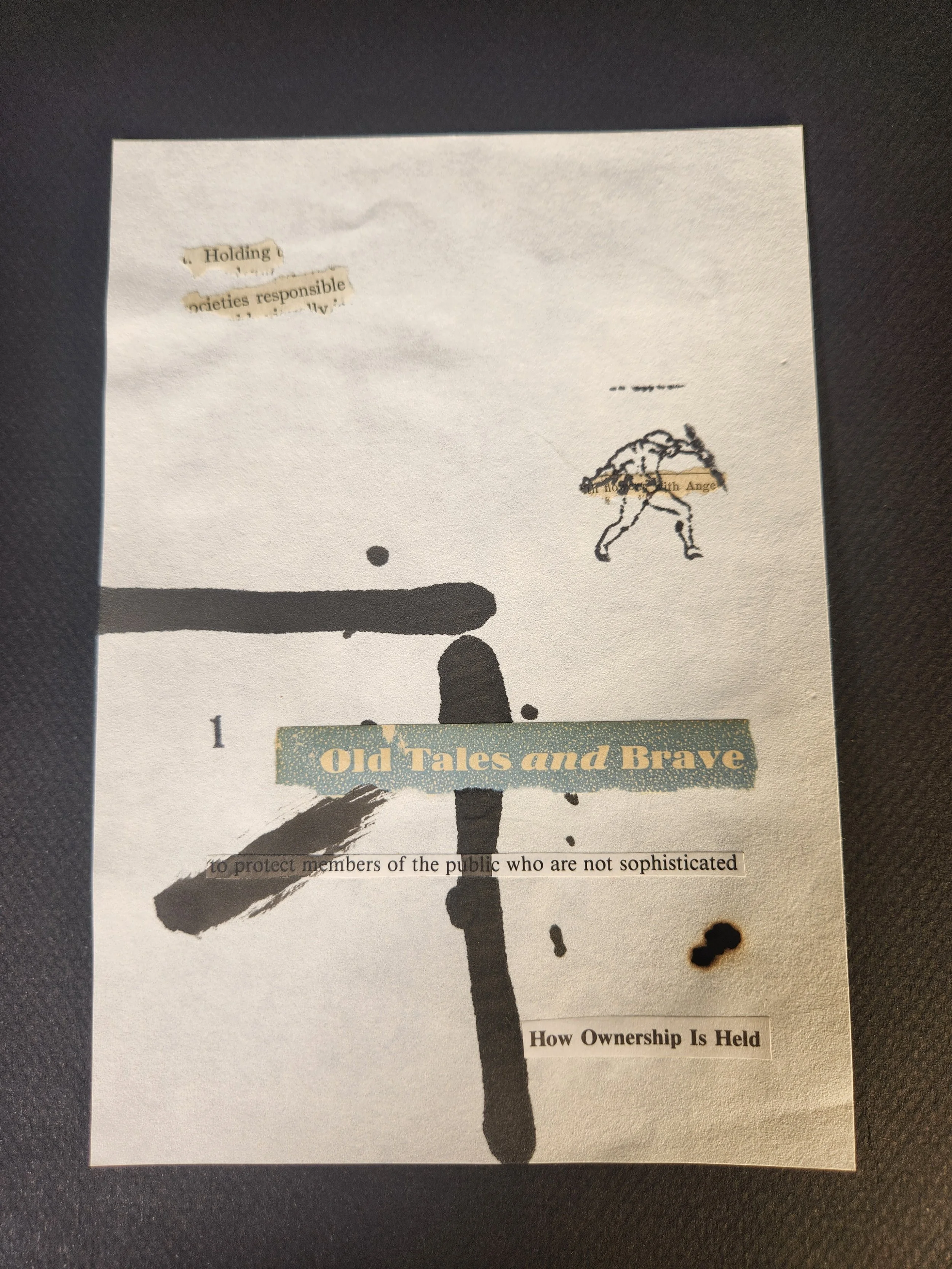 Sumi ink, rubber stamp, burn marks made with an incense stick, and text scraps from printed matter in our Karmic Readings Archive.